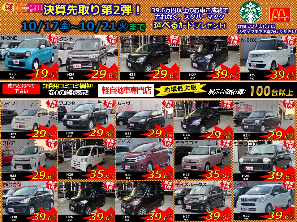 ☆決算先取りフェア☆ ♪10月17日から10月21日まで♪ ☆決算先取りフェア第2弾☆ 39.6万円以上のお車をご契約で選べるカードプレゼント♪ こちらの画面をスタッフまでご提示ください! 皆さまのご来店お待ちしております☆